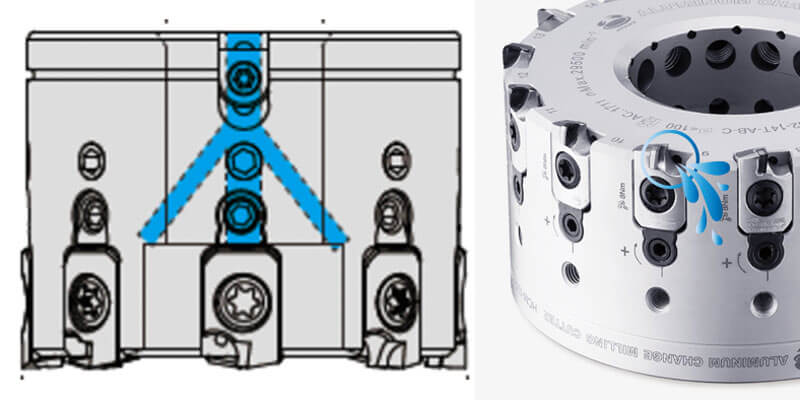 The innovative HCM II aluminum changeable milling cutter features through-tool water cooling to reduce cutting temperature and assists chip removal from the cutting surface. This extends tool life and further improves surface finishes.