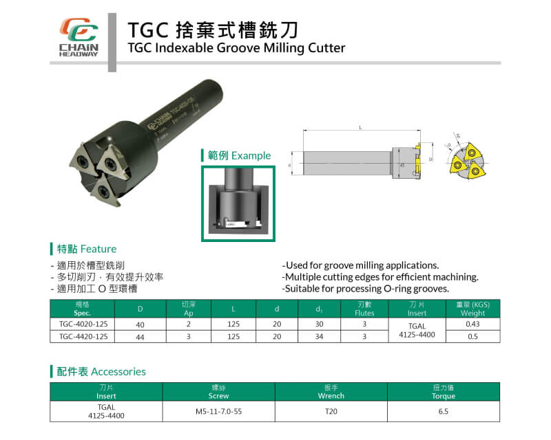 The Chain Headway TGC indexable groove milling cutter, paired with TGAL inserts, is ideal for various slot milling operations, especially for O-ring groove machining. With multiple cutting edges, it significantly improves machining efficiency.
