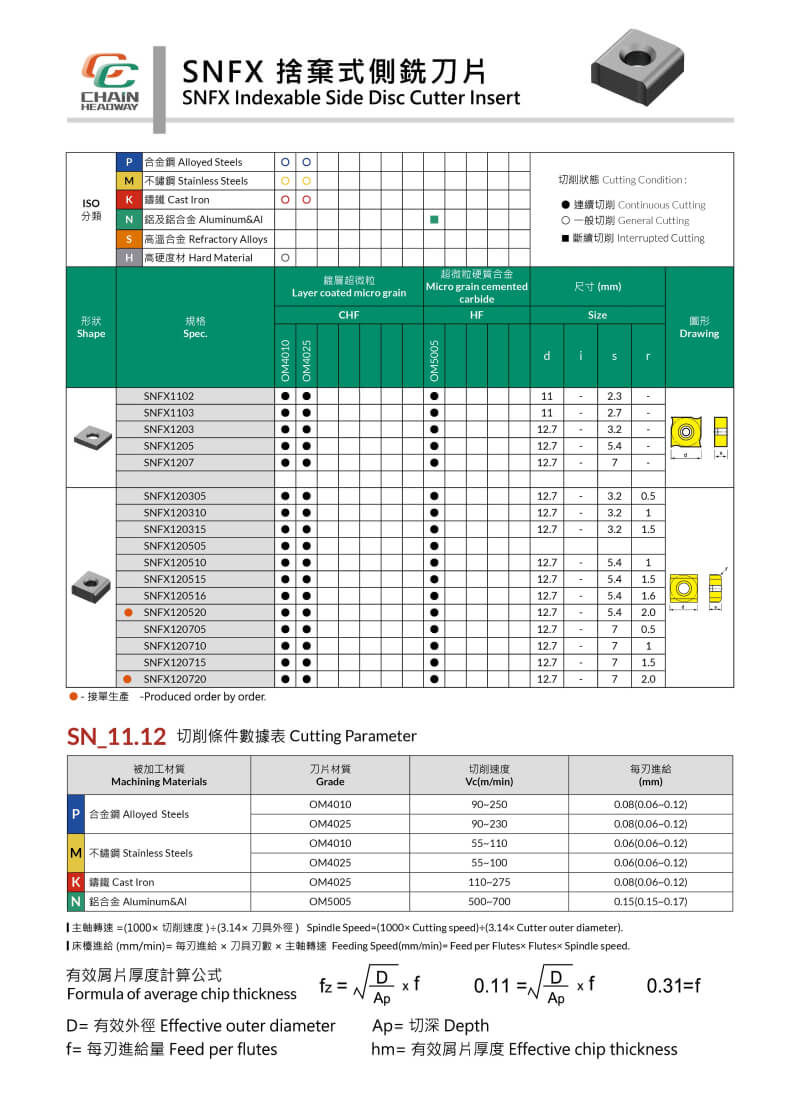 The SNFX insert series is a high-efficiency side milling insert from Chain Headway, particularly suitable for use with the SDC indexable side milling cutter. This insert excels in improving machining efficiency and precision. Key features include: