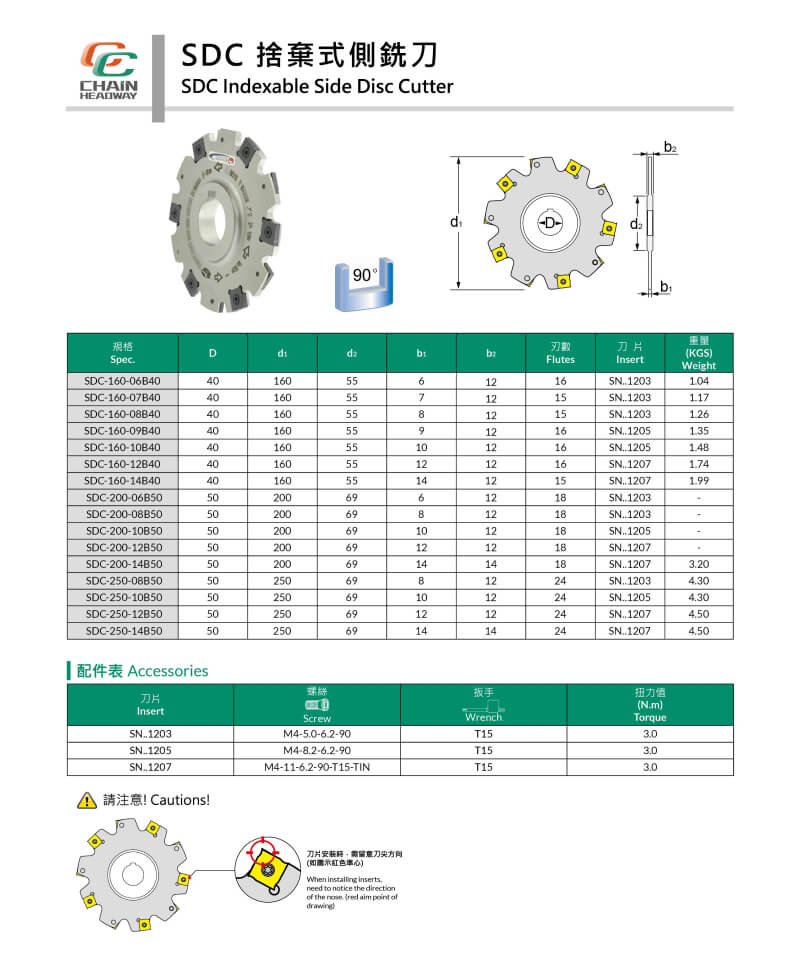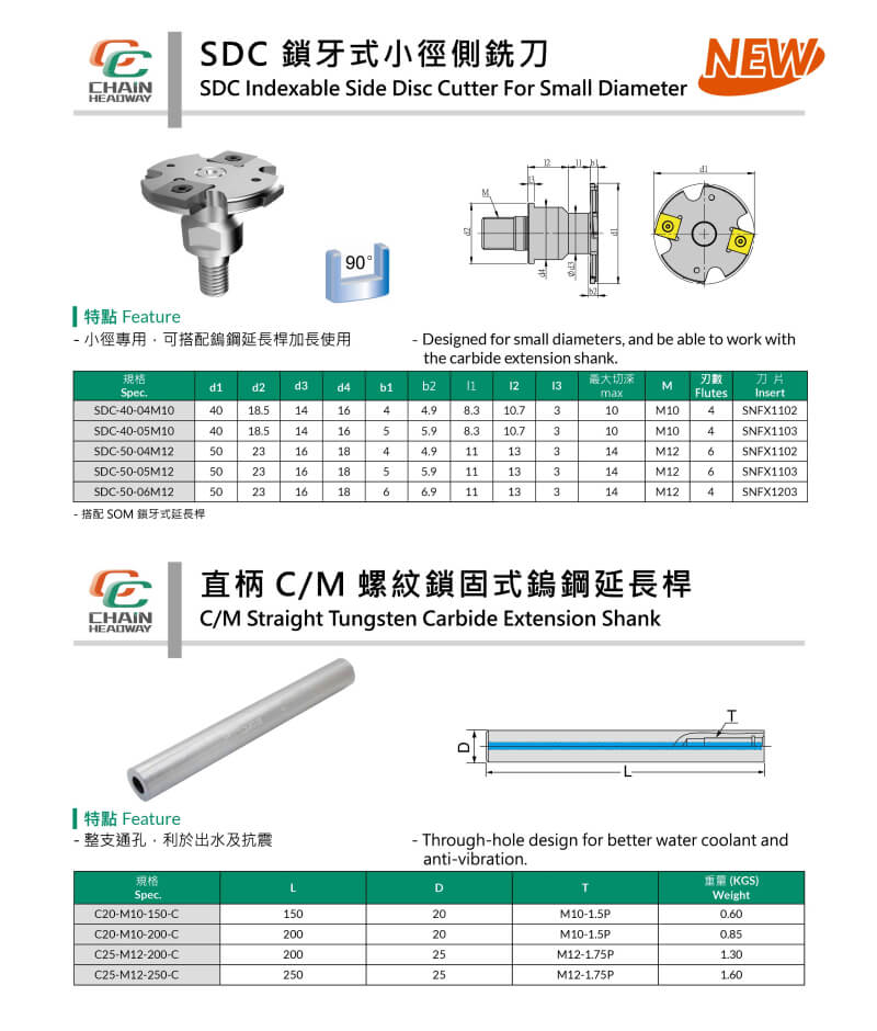 The Chain Headway SDC indexable side milling cutter series is suitable for various groove machining, offering quick insert replacement to improve production efficiency. Applicable cutter head diameter range: 40mm~250mm, covering indexable side milling cutters, threaded small-diameter side milling cutters, straight-shank small-diameter side milling cutters, etc., to meet side milling applications for different materials, sizes, and machining needs.